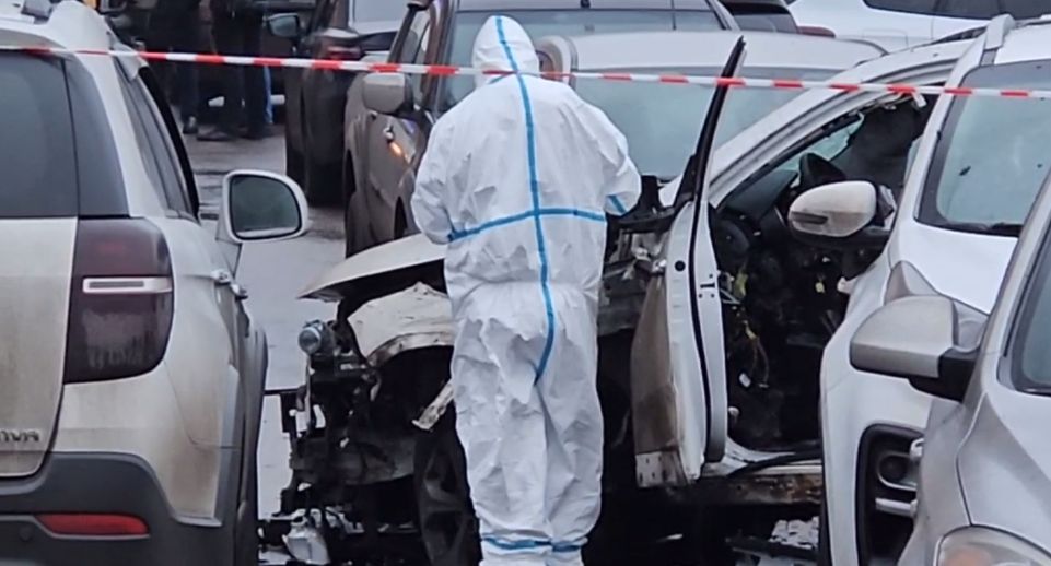Взорванную Kia в Москве осматривают эксперты в защитных костюмах